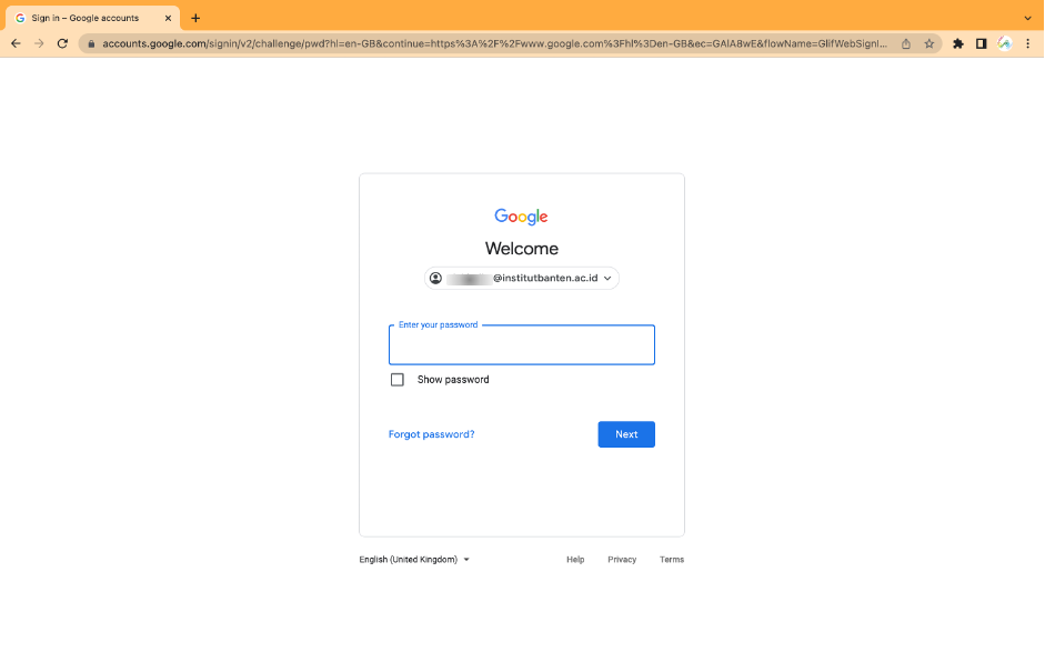 Seperti halnya akun Google/Gmail pada umumnya akun email Institut Banten dapat dibuka di perangkat komputer dengan menggunkan berbagai aplikasi seperti Aplikasi Browser Seperti Google Chrome, Mozila dll. Selain itu email dapat dibuka juga dengan Aplikasi Outlook atau aplikasi pengelola email lainnya. berikut merupakan panduan login pada Komputer dengan menggunakan Aplikasi Google Chrome.